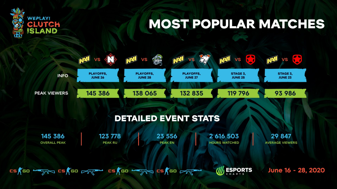 According to Esports Charts, 123,778 people were watching the stream on our Russian Twitch channel simultaneously. The peak moment was on June 26 during a playoff match between Nemiga and NAVI, the WePlay! Clutch Island winner.